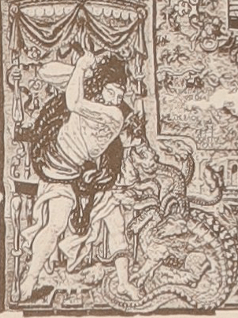 The very earliest mention of a dog in the RGS archives is from the Atlases collection, on a late 16th Century tapestry map of Oxfordshire and Berkshire, made by William Shakespeare’s tapestry-makers (images 1 to 3). The intricate tapestry depicts XXX. In the bottom left hand corner (enlarged in image 3) is ‘Medusa with a dog and Perseus alighting to slay her.’