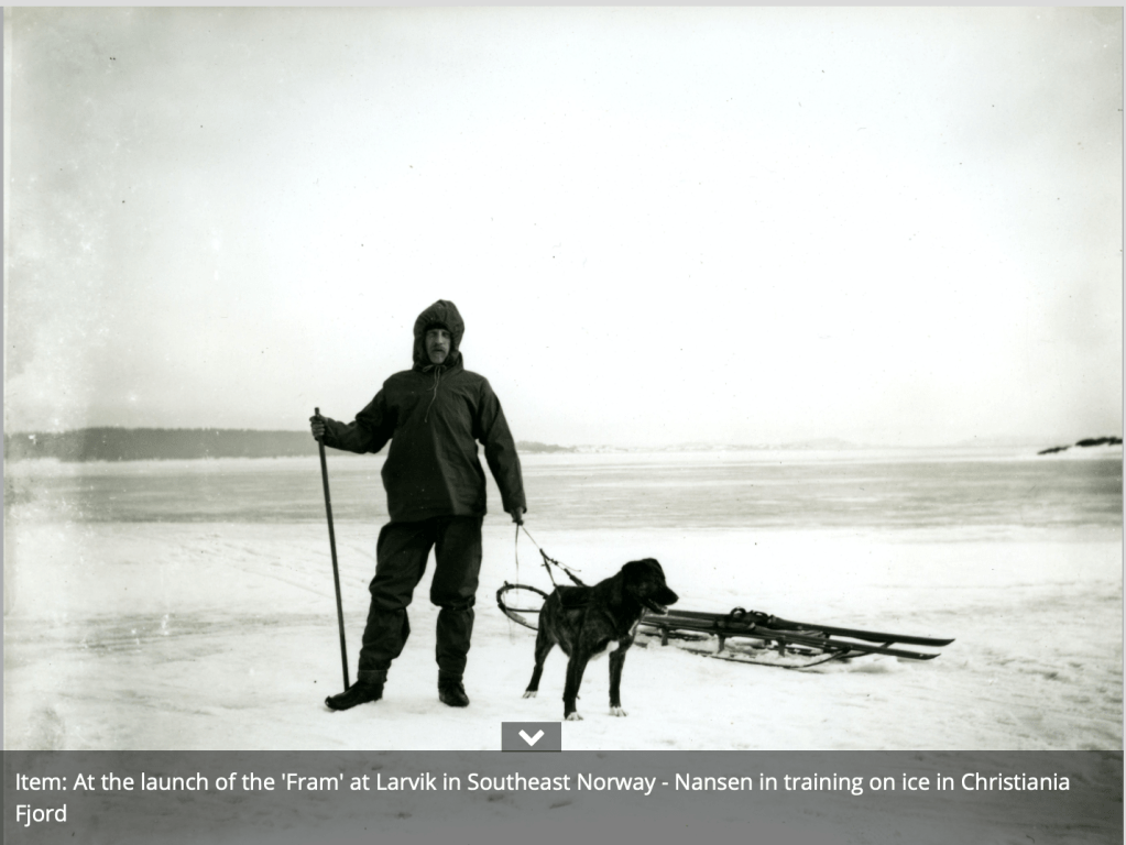 Nansen was celebrated as a hero after the Fram expedition, but what I found particularly interesting was, again, the framing of dogs as companions as well as workers. Nansen, Johansen and the Samoyeds spent a long journey north together, battling extreme conditions. How did they bond? What did their community look like? How did they rely on one another? And how did they take up these multiple roles of companion and worker? In the portraits at the opening of this section, Nansen and Johansen each had a “last dog” who appears to have been their own favoured companion.