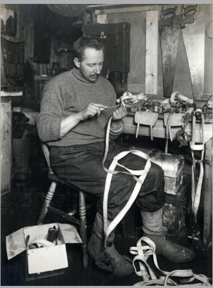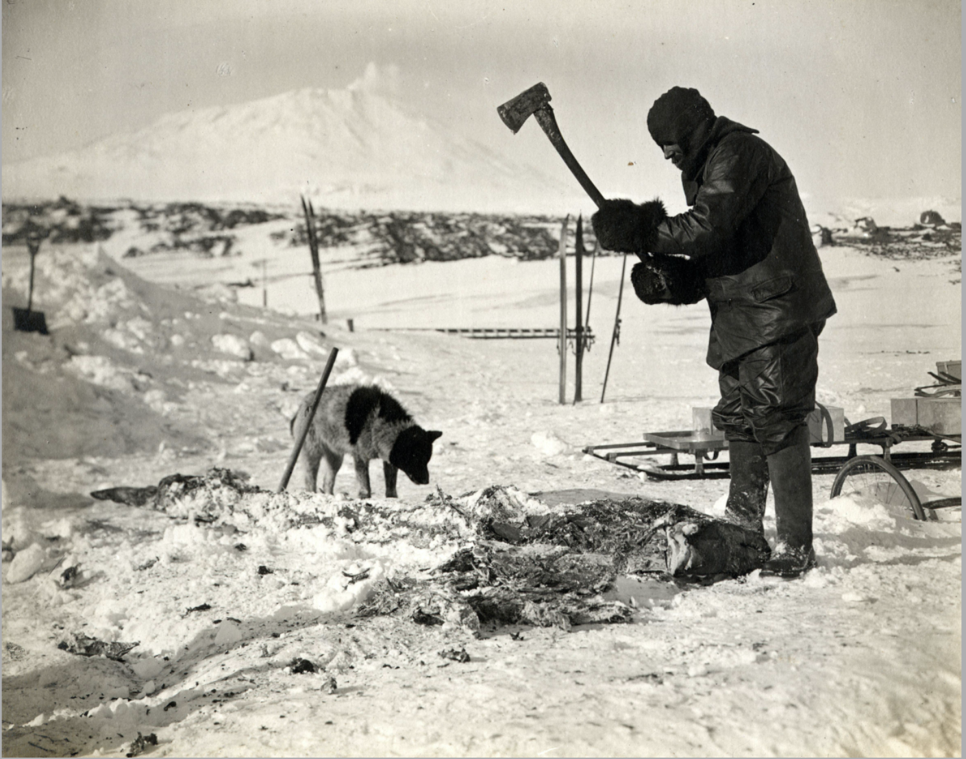 In the images above, Cecil Meares is pictured undertaking some of his dog-work. In the first (L-R), he is sat by the blubber stove with his colleague Dimitri. In the next, he is chopping up seal meat for the dogs to eat. The final image shows him making leather harnesses for the dogs. Each of these tasks relied on violence towards and killing of other animals, to sustain the dogs as workers that the human expedition, itself a result of colonial expansionist violence and geopolitical competition, relied upon.