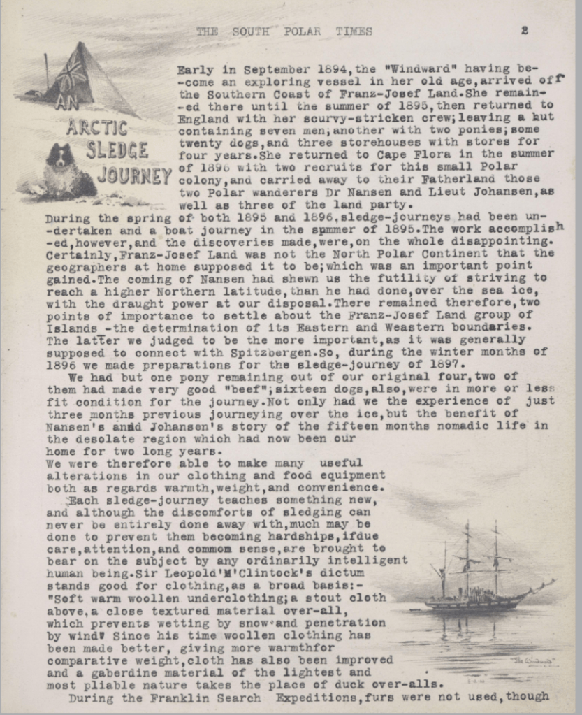 The clipping above is was from the Windward vessel, which was, ‘sold in 1894 to Captain Joseph Wiggins, she was bought later in the same year by Alfred Harmsworth for the use of Frederick G. Jackson in his exploration of Zemlya Frantsa-Iosifa (Franz Josef Land). Windward was Jackson’s ship for three years, including one winter beset in the ice; journeying from her, Jackson substantially recharted Zemlya Frantsa-Iosifa, and the ship brought home Fridtjof Nansen after his epic drift with the polar ice’ (Buchan, 2009). In the clipping, the author reveals that they lost ponies and several dogs, but that the former had made very good “beef” for the men.