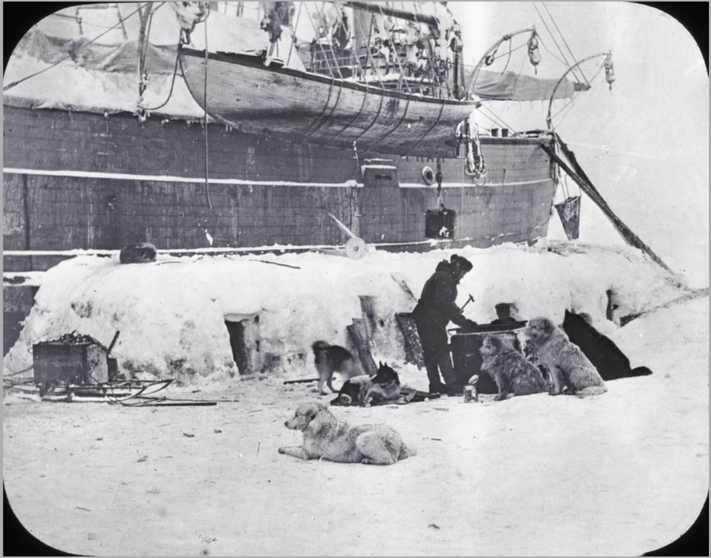Even before this small group of dogs and humans went ahead alone, it is suggested from photographs of the expedition that dogs and humans were living in close quarters, and also that Nansen had been focussed on fostering a close relationship with the dogs. In the below images, dogs and humans and dogs are intermingling, playing, and communing around the Fram from the beginning of their shared journey.